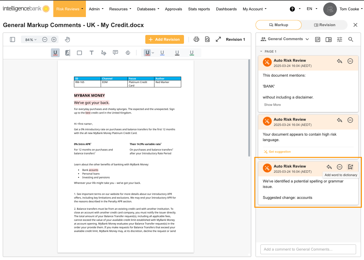 The Content Risk Review feature includes an optional Spelling and Grammar capability, designed to help clients maintain high content accuracy and consistency. Unlike built-in spell-checkers in Microsoft Word, PowerPoint, and Google Docs, the Spelling and Grammar feature is exclusive to content reviewed within the platform and is not available in these add-ins.