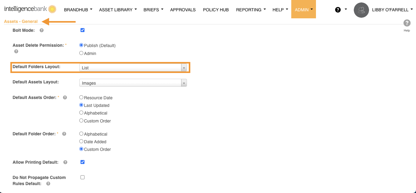 To select how you would like your folders to be ordered by default, go to Admin > Settings and then scroll down to the "Assets - General" Section