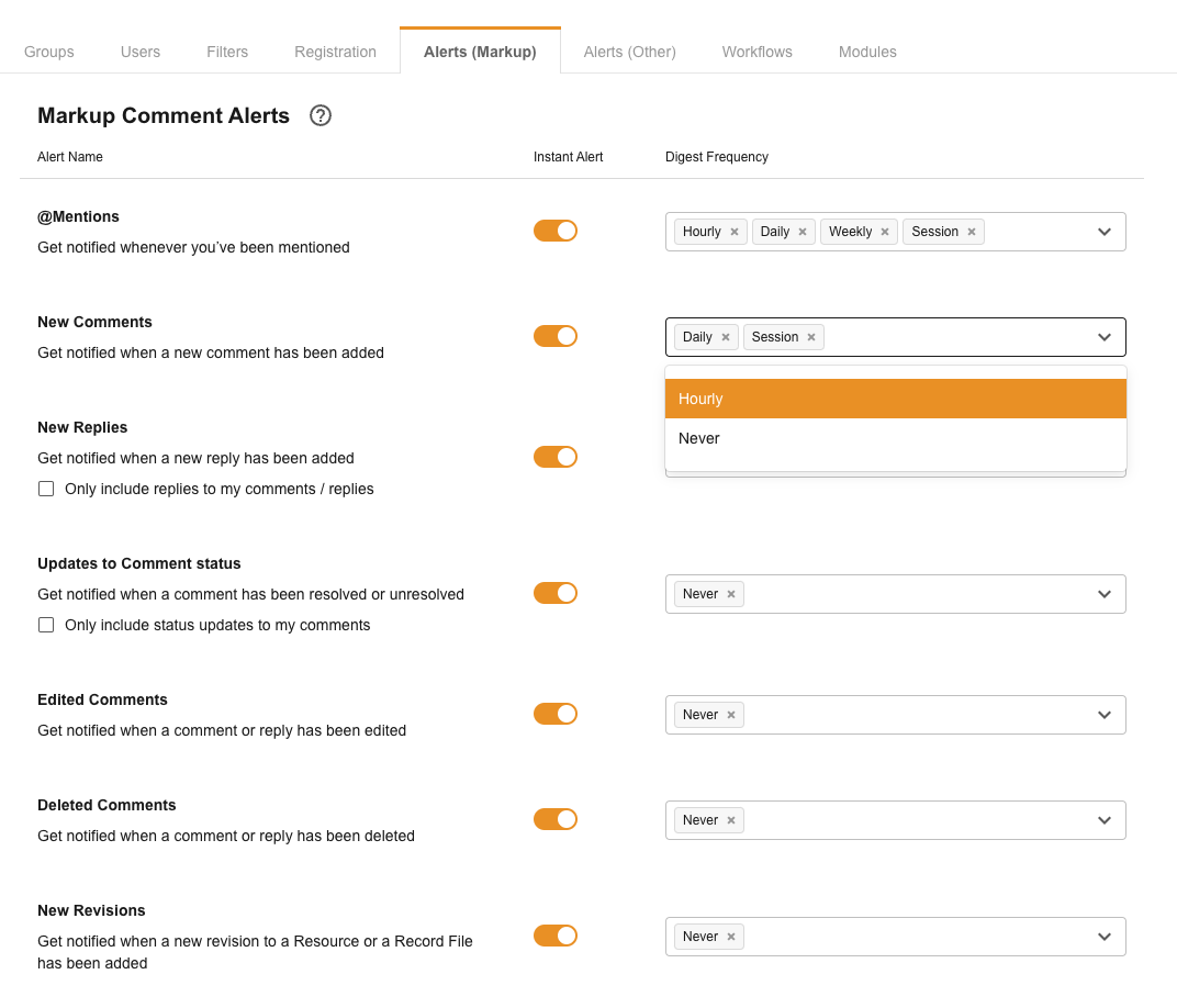 Alerts (Markup) control the frequency of notifications related to Markup Comments for Approvals or General Markup Comments and can be triggered instantly or set to a specific frequency in a Digest email.