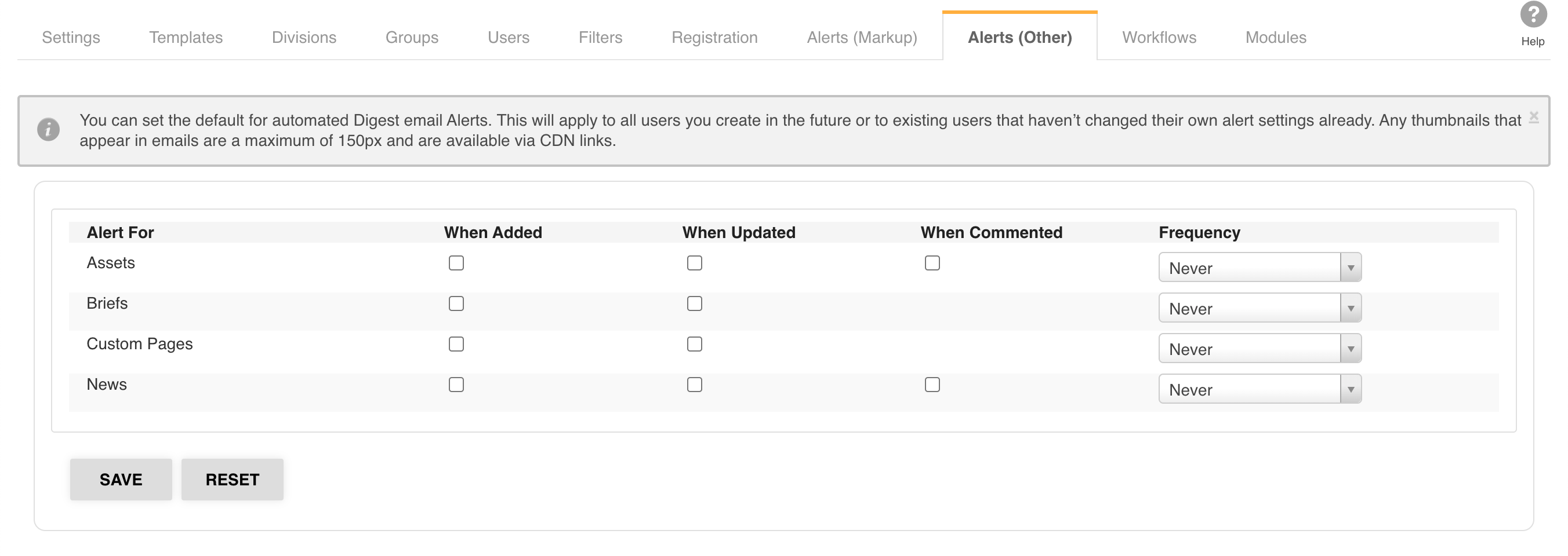 These alters can be triggered by when an action takes place within one of the above modules and are sent in the form of a Digest email that is periodically emailed to the user depending on what frequency is selected.