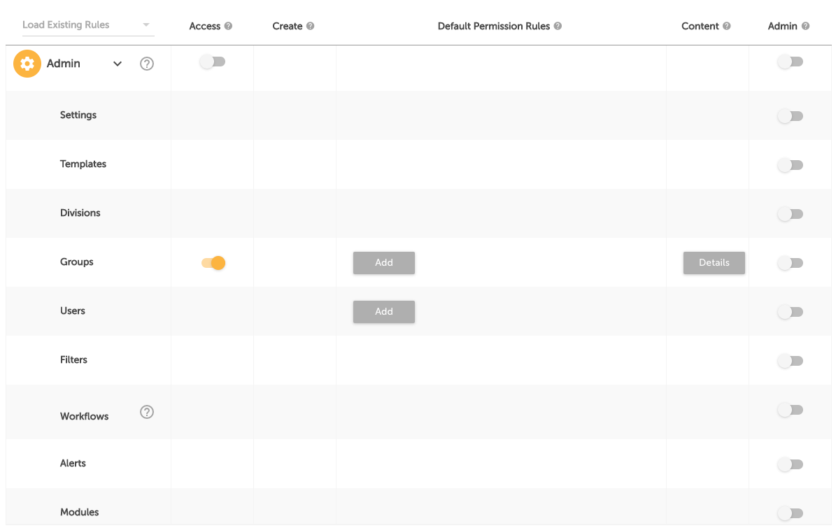 Create & Admin level permissions are both activated by clicking the switch in that column. As the highest level of Permission available, the Admin switch overrides all other options.