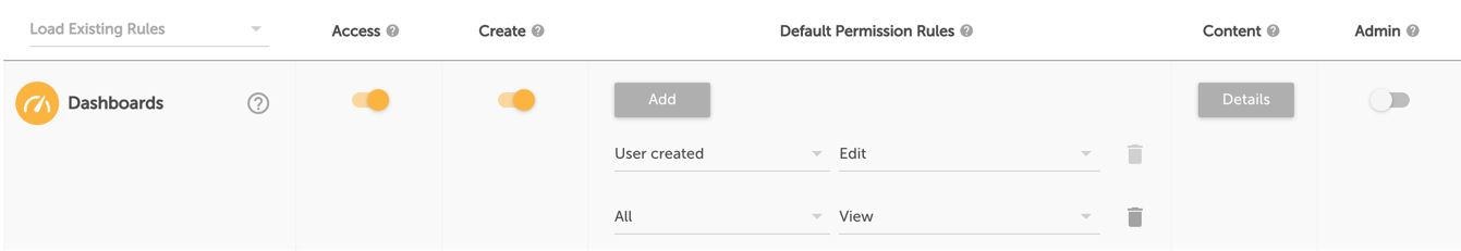 - Admin: This gives Manage access to all dashboards that are not set to Private, independently of other rules or custom permissions. This is the highest level of permission.