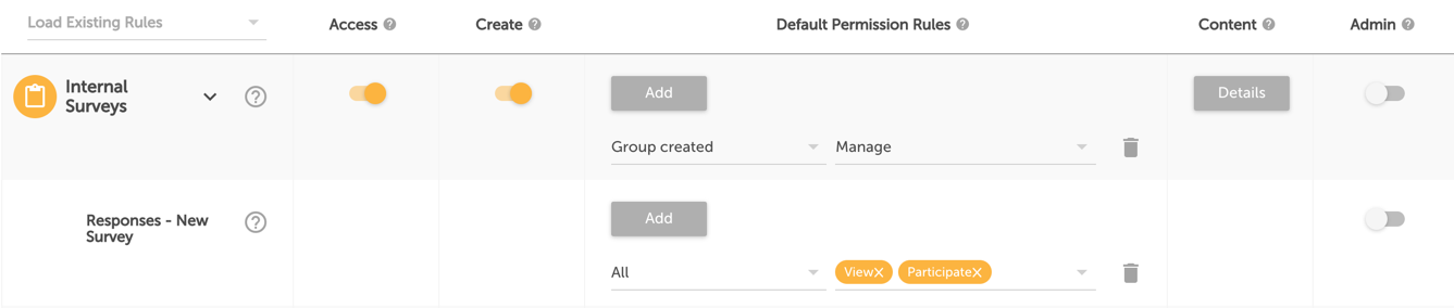 - Admin: This gives Manage access to all surveys, independently of other rules or custom permissions. This is the highest level of permission.