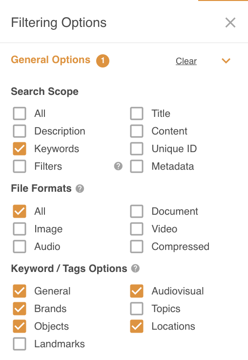 You can also filter by File Format which will further refine the Keyword / Tags Option section to the relevant fields.