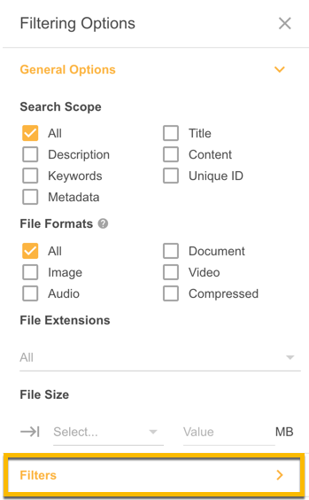 1. Open the Filtering Options side panel and go to the Filters section (highlighted below) beneath the General Options. Note that if you're on a small screen, you may need to scroll to this option.
