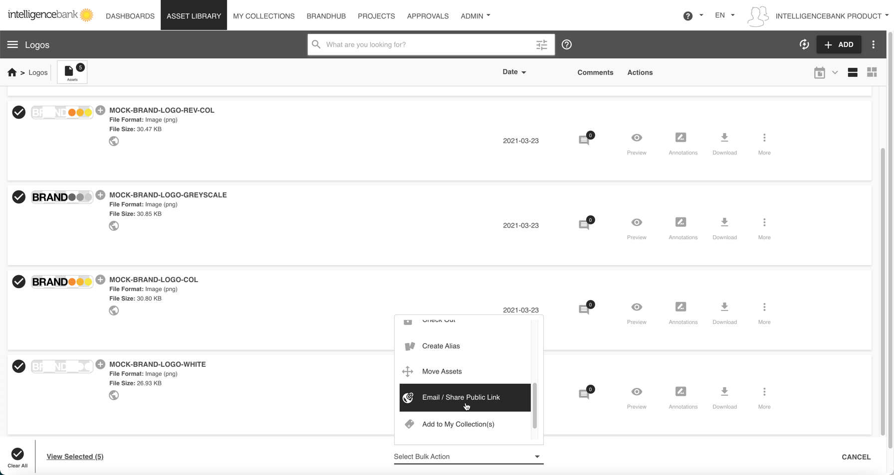 To share a temporary or permanent display link to a selection of Resources with non-registered users, click the Email / Share Public Link bulk action.