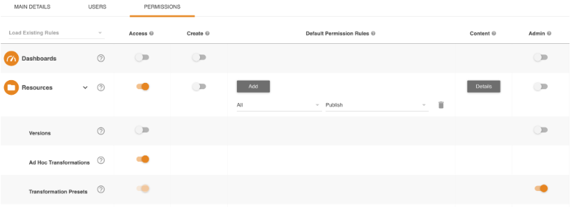 - Access: This allows users to apply Ad Hoc Transformations on Resources they have Access permission on, when options are available.