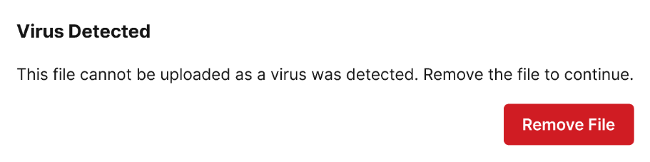 On Upload, a scan will occur automatically, including for the content of Zip files, and if a virus, trojan or other malware is detected, an error message will be displayed (as pictured below), and the user will not be able to save the file into the platform.