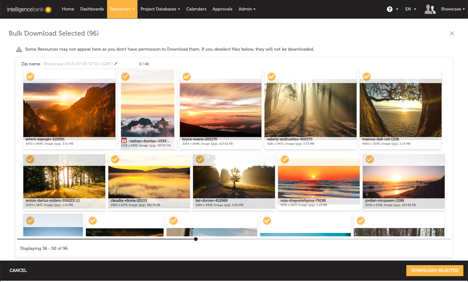 If you have permission to Download all the selected Resources, you will be taken to the Bulk Download overlay (pictured below):