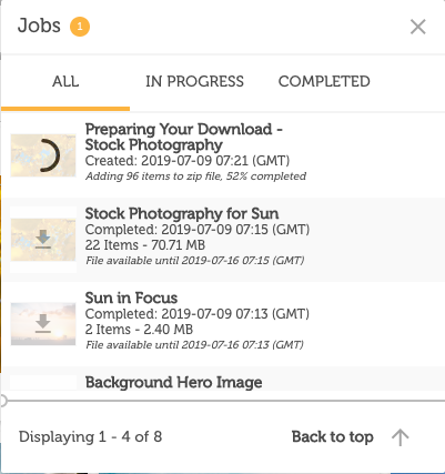 In the Completed and All tabs, you can download previous Jobs that have been completed. These are stored for 7 days before the Download Job will be removed from the list. Note that this does not use additional storage