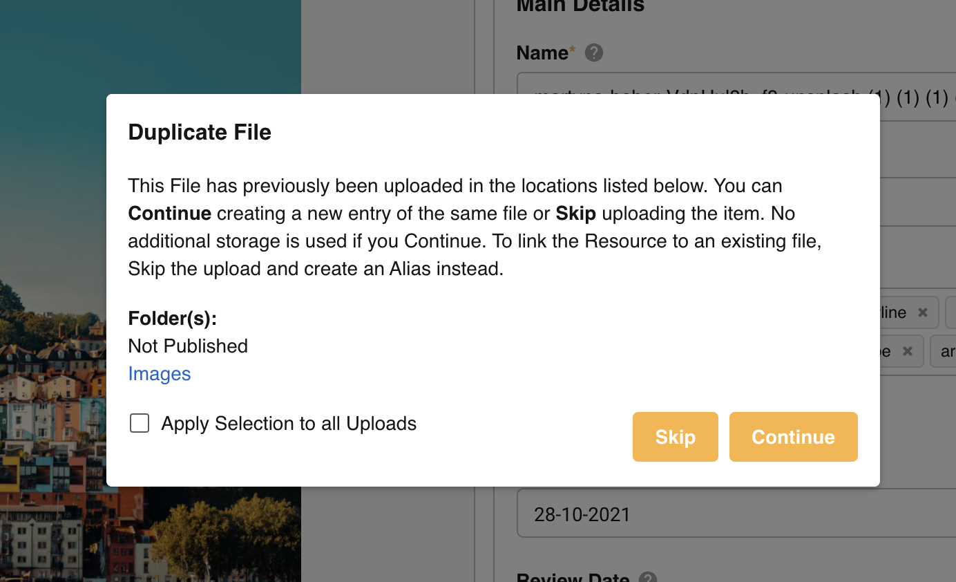 Additionally, there's a checkbox option to Apply Selection to all Uploads. If selected, once you click Continue or Skip, your selection will apply to all other Duplicates detected in your current Upload request. Note that if you add new files and these are duplicates, you will be able to choose which option you would prefer again.