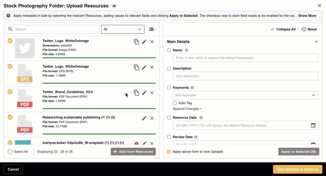If you add multiples of the same file within a Bulk Upload request, these files will be classified as an Upload Duplicate. All of these files will appear in the Upload list and the user will be given the option to remove or keep the file.