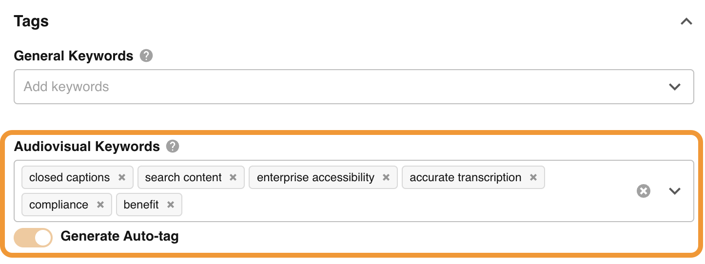 - Audiovisual Keywords: Auto-tags for Audiovisual Keywords are detected from insights on the different keywords discussed in media files. These keywords are detected from the speech and visual text and automatically tagged against the asset.