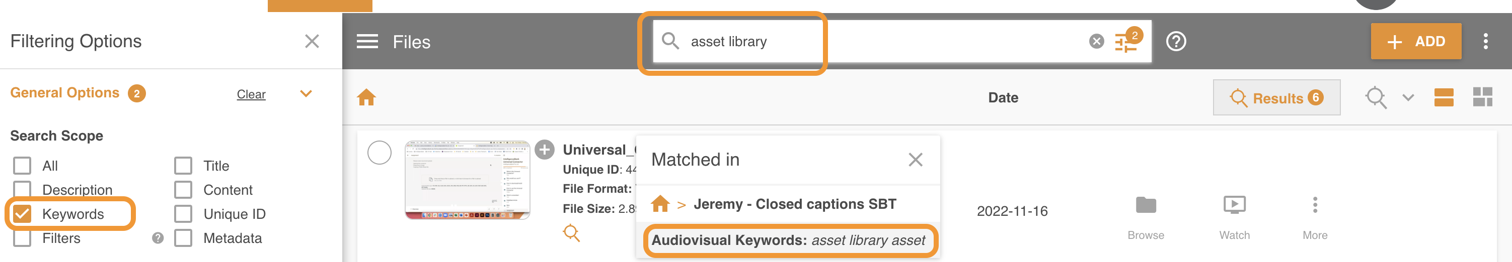 - Users can enter keywords in the search bar to search for assets with Audiovisual Keywords.