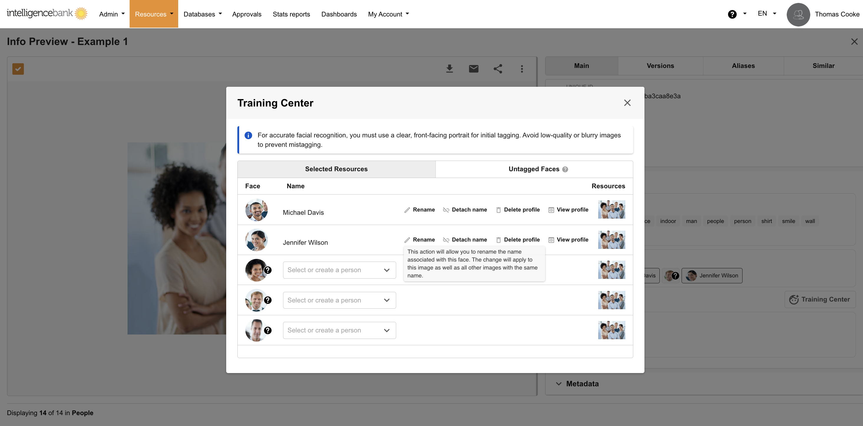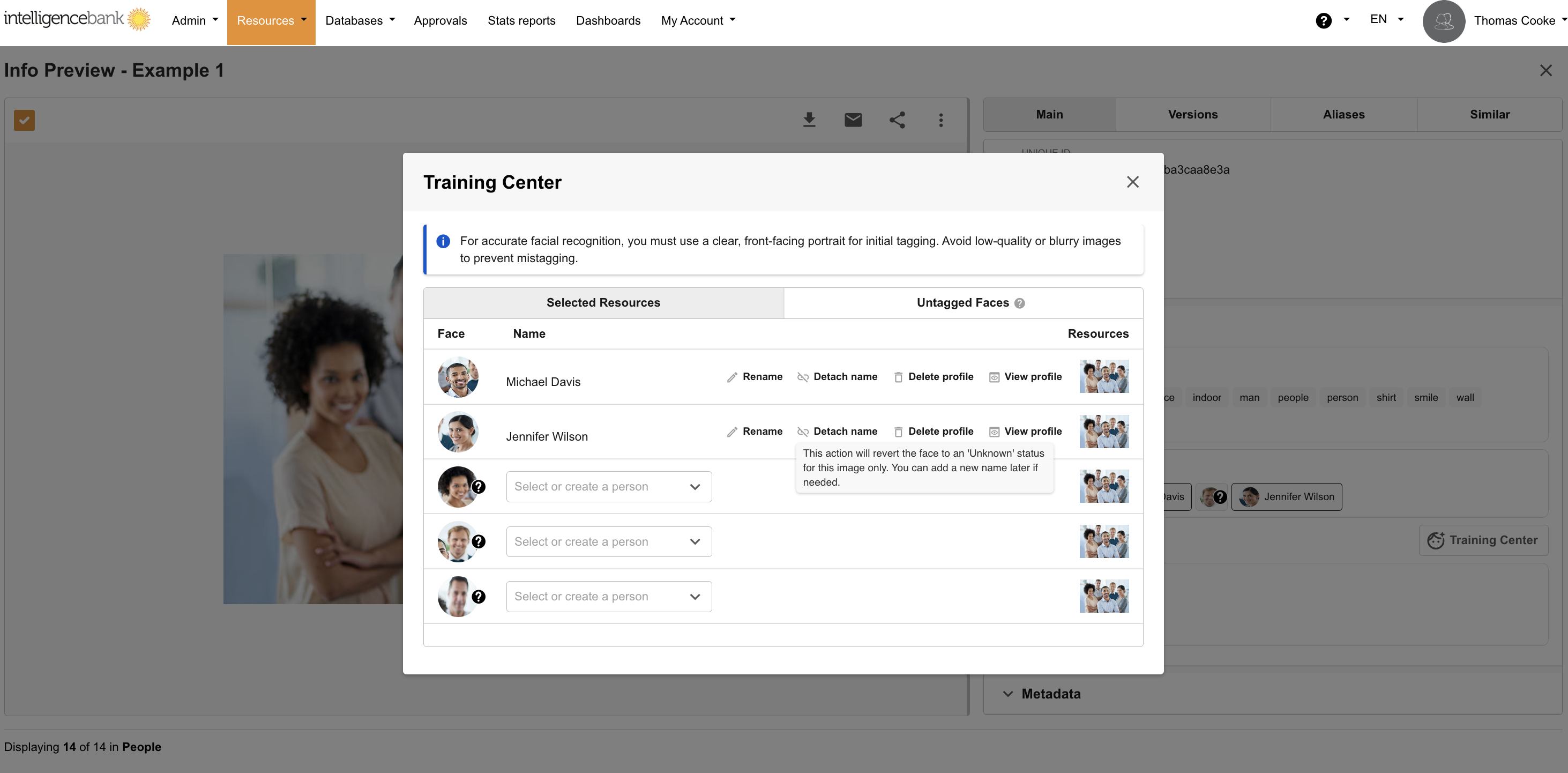 From Training Center, you can add names for Unknown Faces as well as Rename, Detach, Delete or view the Profile of existing known faces.
