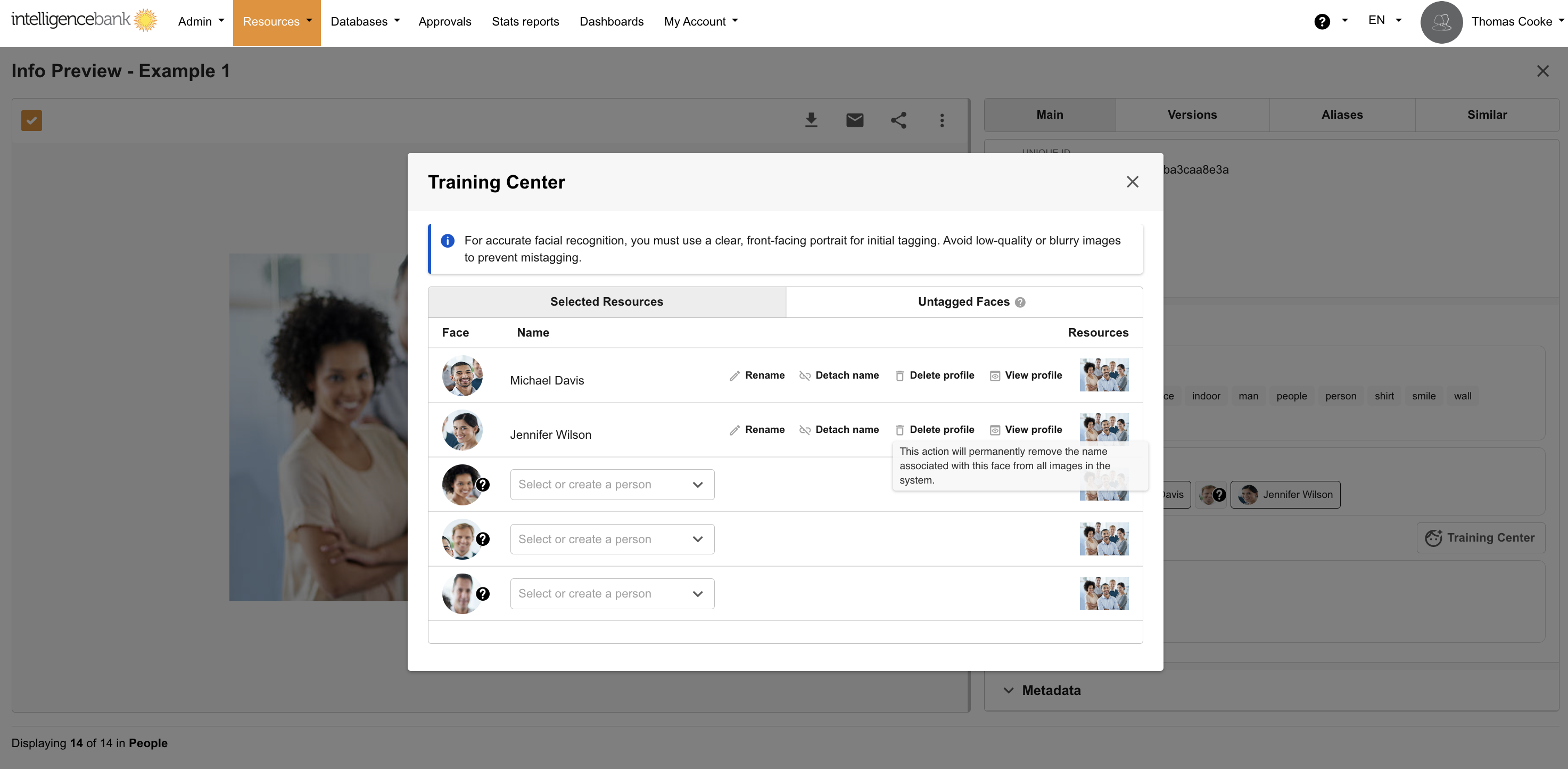 Clicking on View Profile will display all resources with that name tagged in them. From here you can detach any that are not that person.