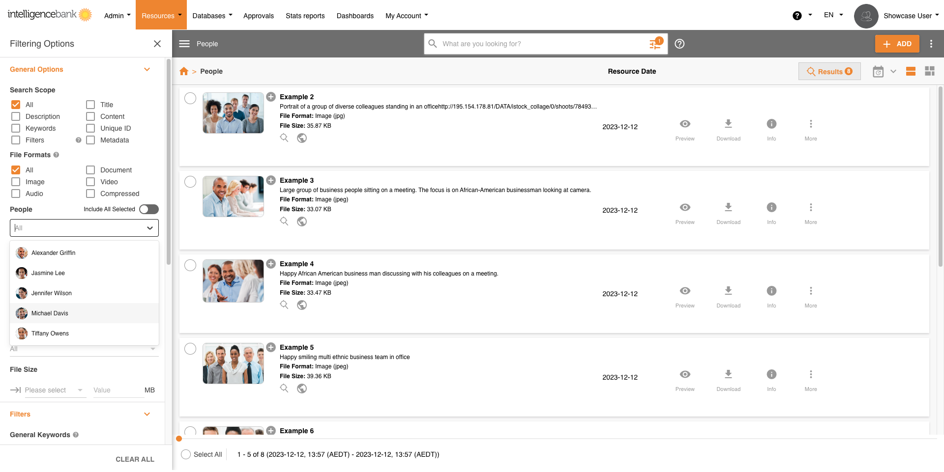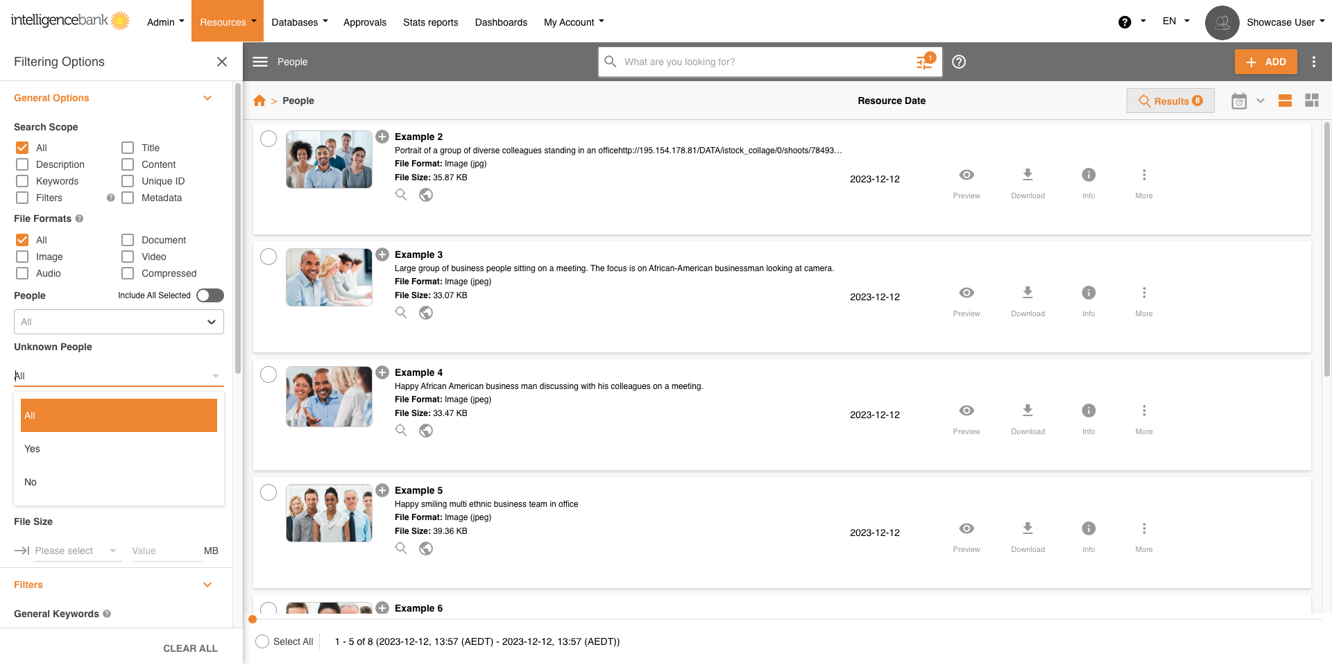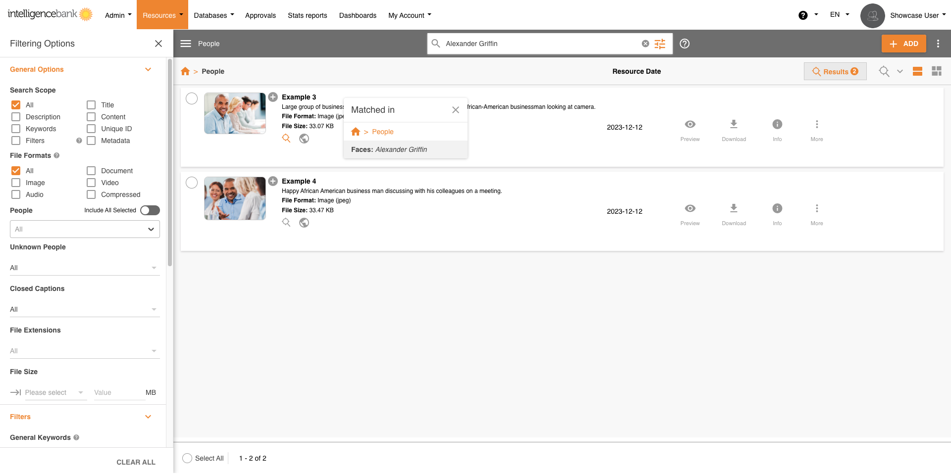 Within the Resource Filters you can filter by Known Faces. Select the name or names required and all Images will be filtered as a result.