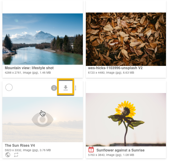 To access this feature, go to the image you wish to Download and click the Download icon. This will be available with the actions on the right of the page if you are in the List View, or if you hover over the image when in the mosaic view.