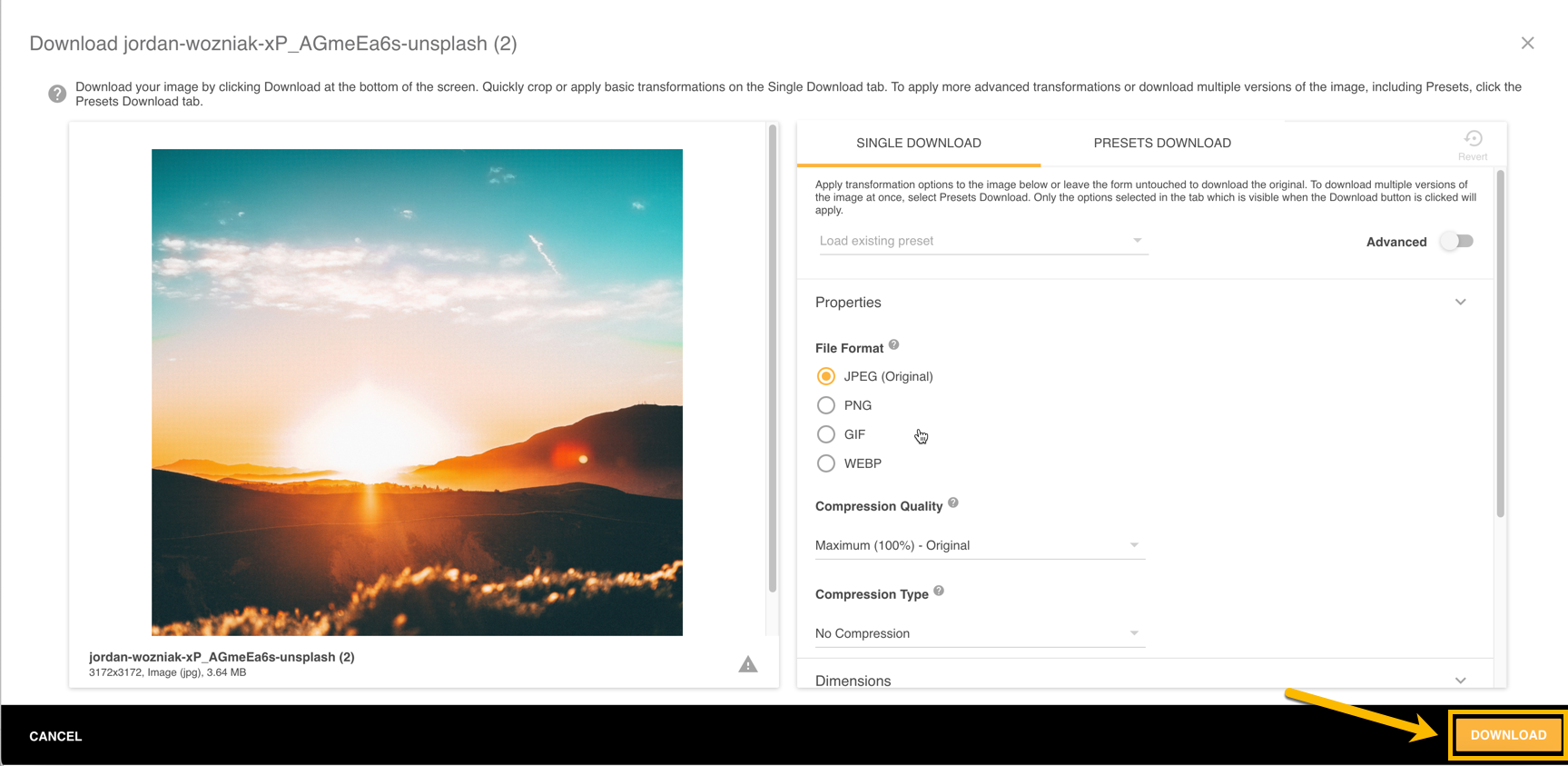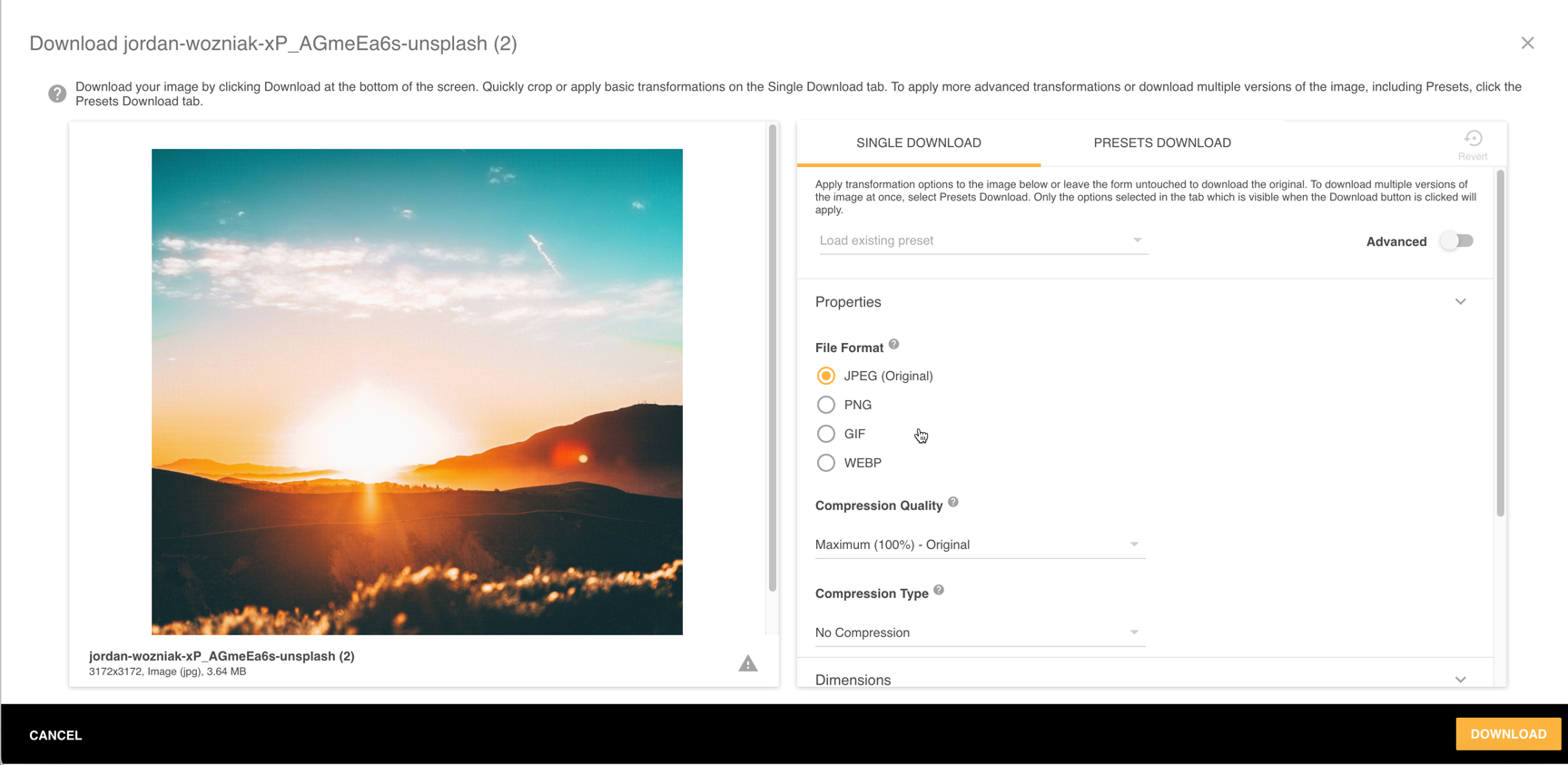 - Properties: You can change the File Format, Compression Quality and Compression Type. Note that if your file type is not supported as an output transformation, you will need to switch to another File Format to view these options or download the original file.
