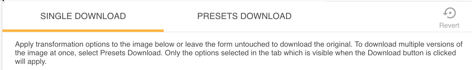When downloading a single image file, users are able to download the original image, as well as downloading additional versions of the image. This can include downloading existing or newly created Presets and Transformations. Similar to the options available in Bulk Image Download, these additional transformation options are generated after the user has clicked the Download button and will be downloaded in a zip folder. If the user only downloads the original image, this will be downloaded immediately as a single file.