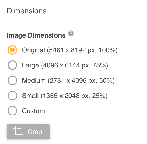 - Dimensions: You can change the dimensions of the image. You can also click the Crop button (pictured below) to quickly crop the image.