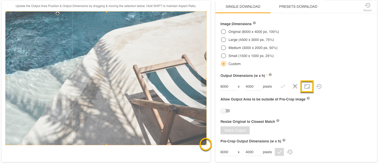 - Output Dimensions: These can now be changed, either in the Output Dimensions field or by dragging the border dots (highlighted in the circle below) on the image itself.