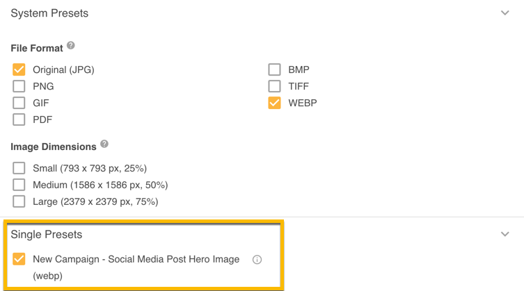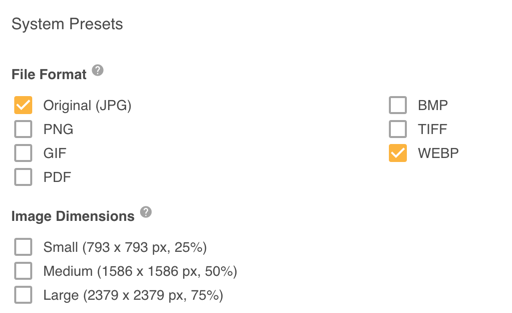 Note that for each of the options above, these will be applied to the Original file separately. For example if you select PNG and Small, you will receive two files, the Original file as a PNG and the Original file with Small Dimensions. It will not download a PNG file which is Small. If you wish to do that, see Ad Hoc Preset or Single Download.