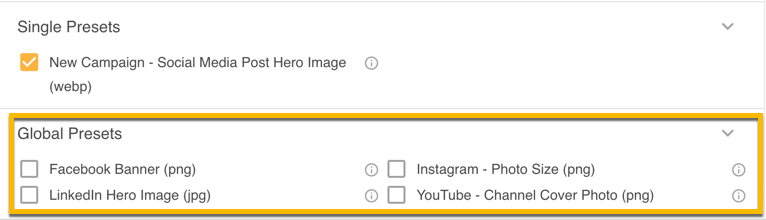 Global Presets are created for common transformations that need to be regularly applied to images. These are available to be selected and applied in Single Download. If Global Presets exist, all users will be able to apply them when downloading images. Simply select the required Global Preset in order to include it in your Download.