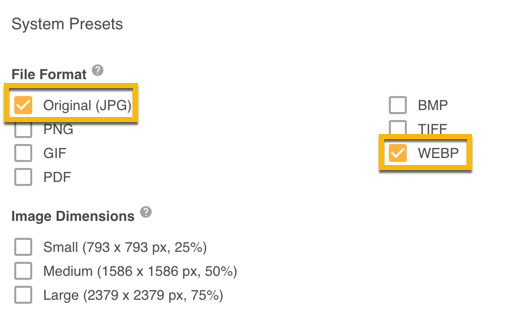 - File Formats supported by default include: the Original, JPEG, PNG, GIF, BMP, TIFF, PDF, WEBP
