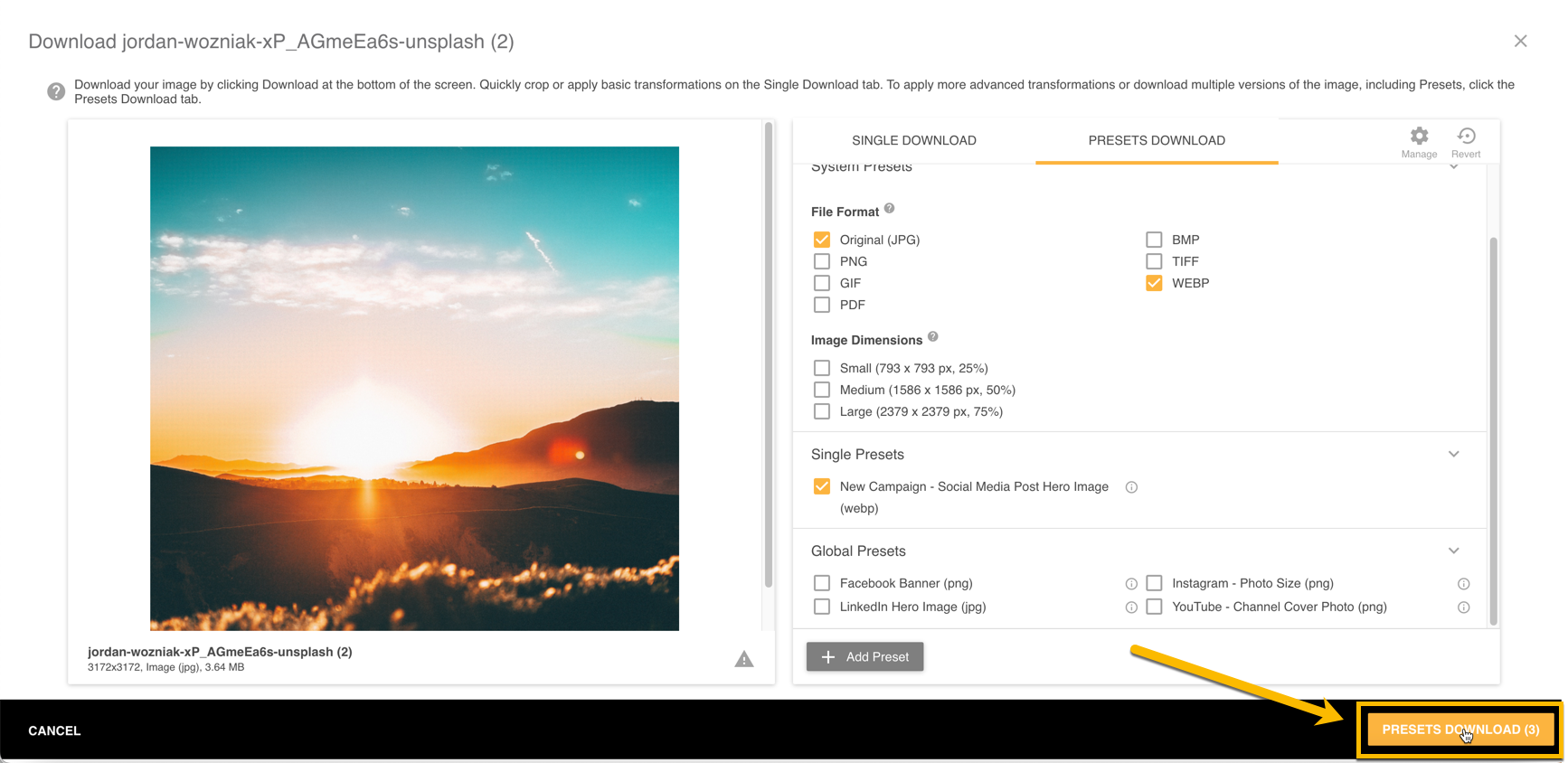 The Presets Download tab allows you to download multiple versions of the image at once. Multiple types of Presets can exist.