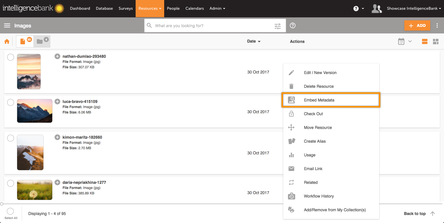 In the actions dropdown of an image asset, click on the option called Embed Metadata. You will then be taken to the metadata embedding page.