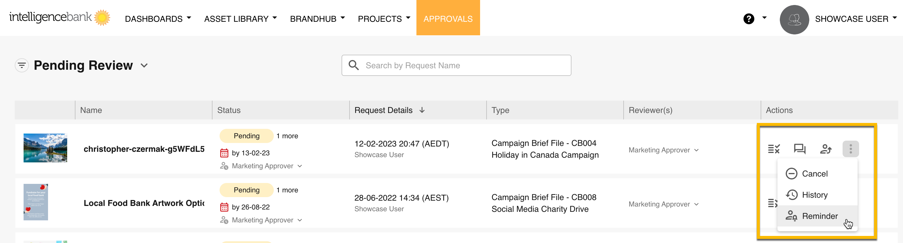 In the Approvals Request List (in your 'Workflow' or 'Approvals' tab) select the dropdown menu for the relevant request and select Reminder: