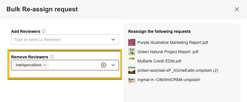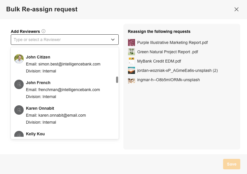 Similar to the Bulk handling above, the single Re-assign action allows users to add and / or remove Reviewers from the request selected.