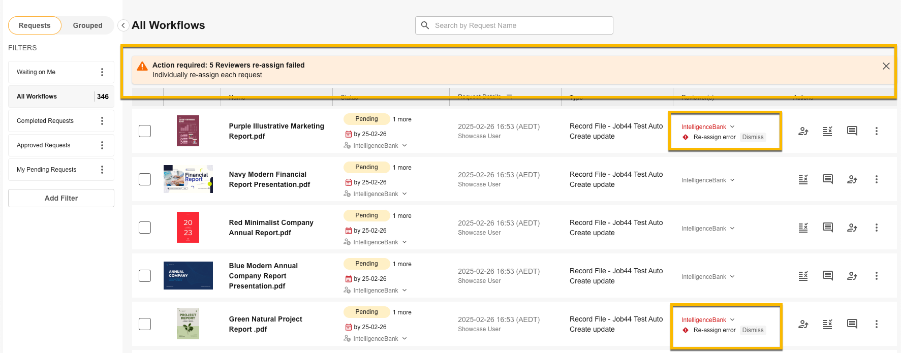 - If errors occur during Bulk re-assign, a banner will appear at the top of the Approval List page showing the number of affected requests