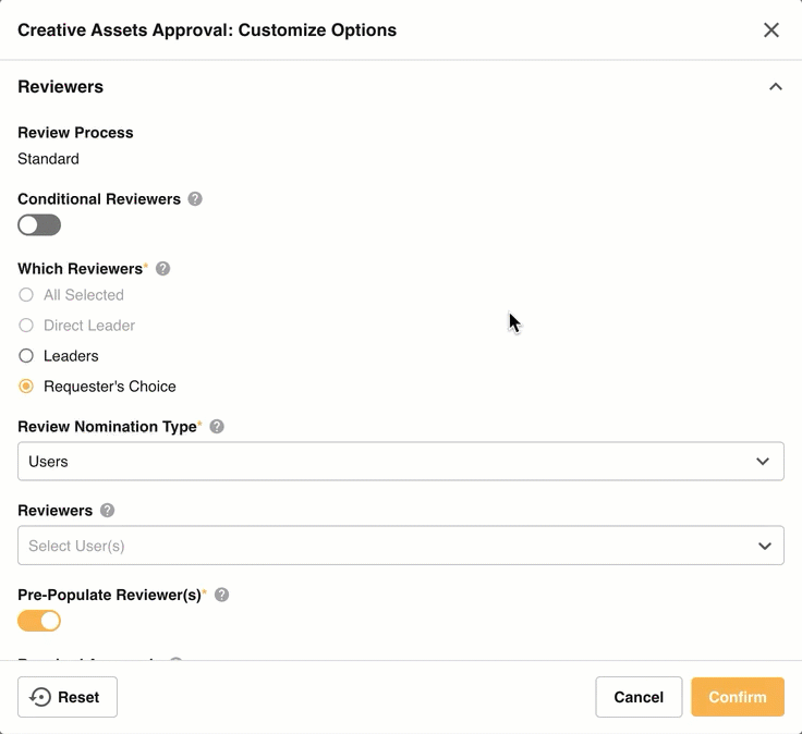 - Reviewer Nomination Type can be left as 'Users' or changed to 'Groups'. You can select specific User(s) or Group(s) from the platform, or tie this to whomever is selected in the User Lookup or Group Lookup fields from the database. The requester's Leader can also be selected.