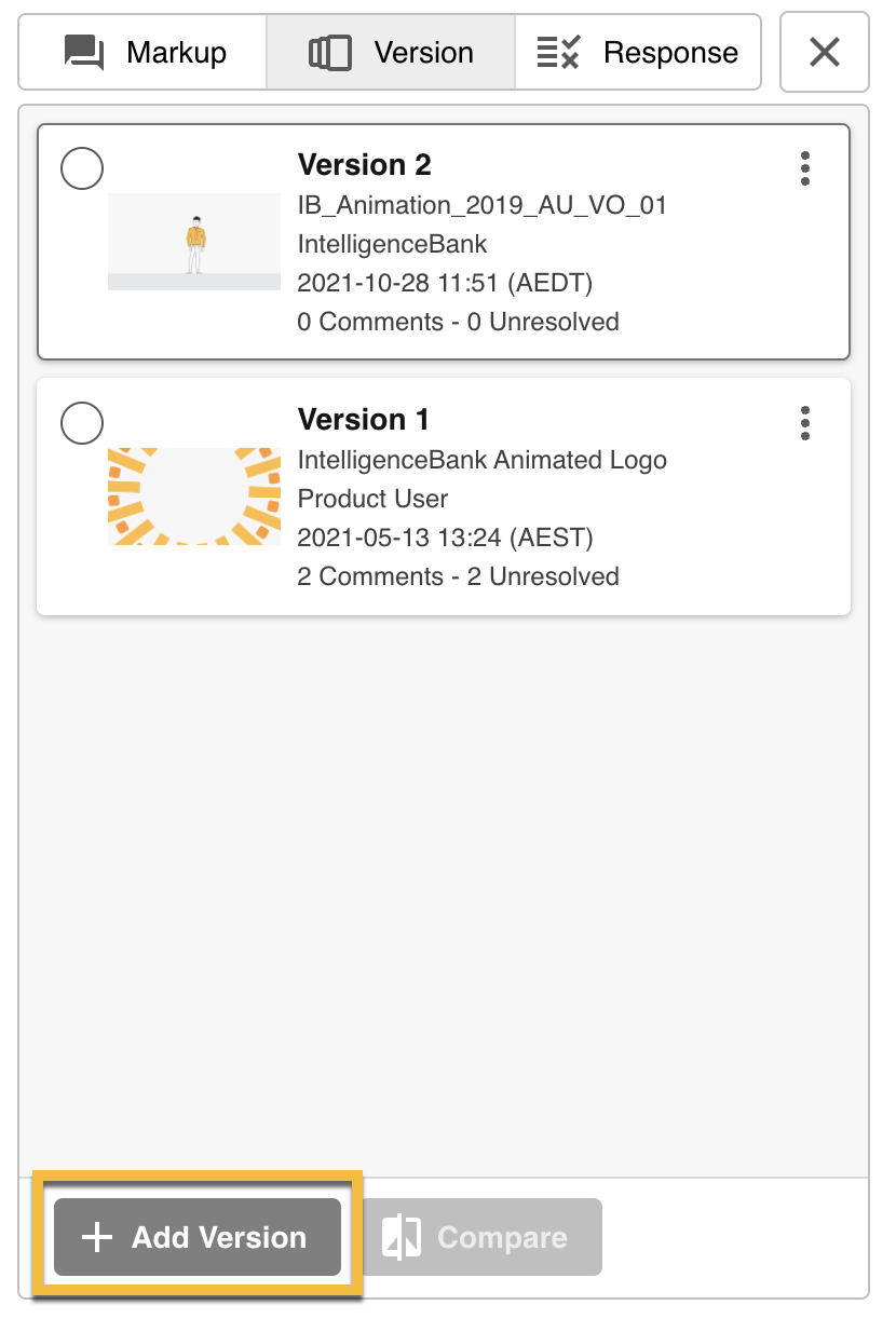 An Add button will also appear at the bottom of the Versions / Revisions tab (pictured below), allowing you to Add a new Version / Revision within the Request. This means that you will be able to make the changes requested in the Markup Comments and upload the updated file, without having to begin a new request.