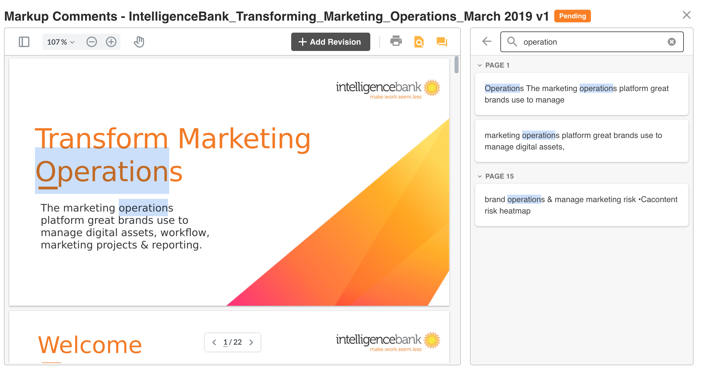 Users can Search their Documents for specific keywords or phrases. To do this, simply click on the search icon above the Document preview. The Comments panel on the right will update with a search bar where you can enter your search term.
