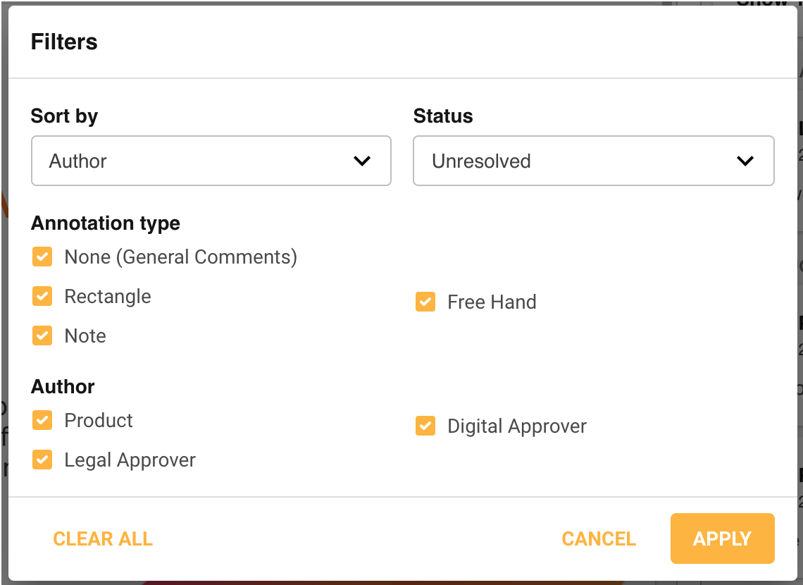 Users can Filter our Comments based on the Status, ie Resolved / Unresolved, the Annotation Type or the Order.