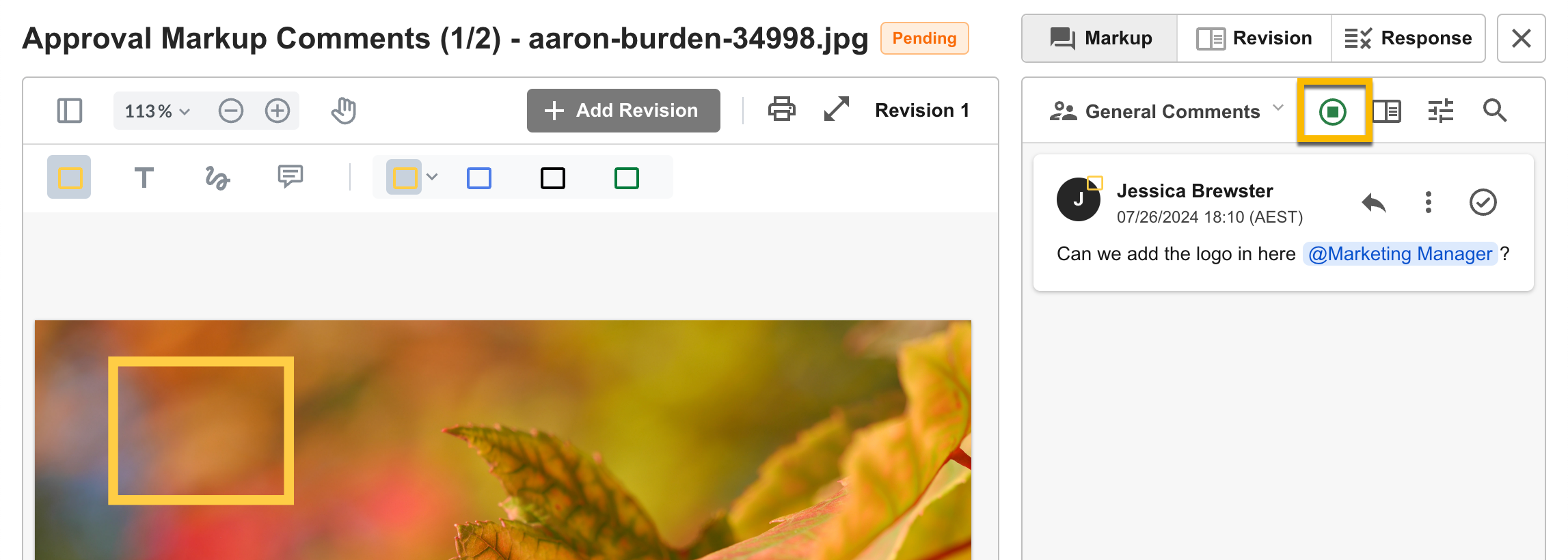 Other Markup Comment articles available include: Markup Comments Overview, Markup Comments Support, Access & Restrictions, Markup Comments & Annotations, Video Markup Comments & Annotations, Add New Versions / Revisions in Markup Comments, Instant Alerts (Markup Comments)