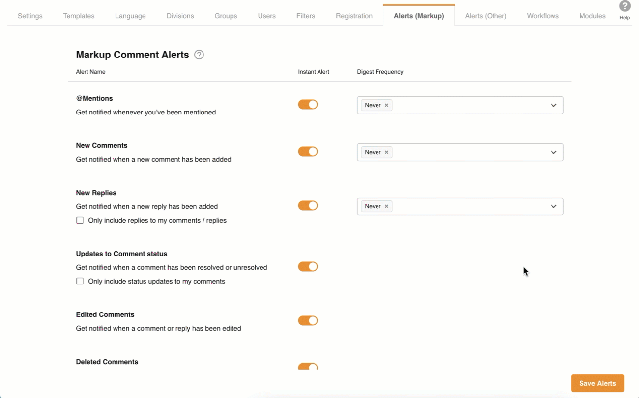 Once any changes have been made, click Save on the Alerts page to apply them.