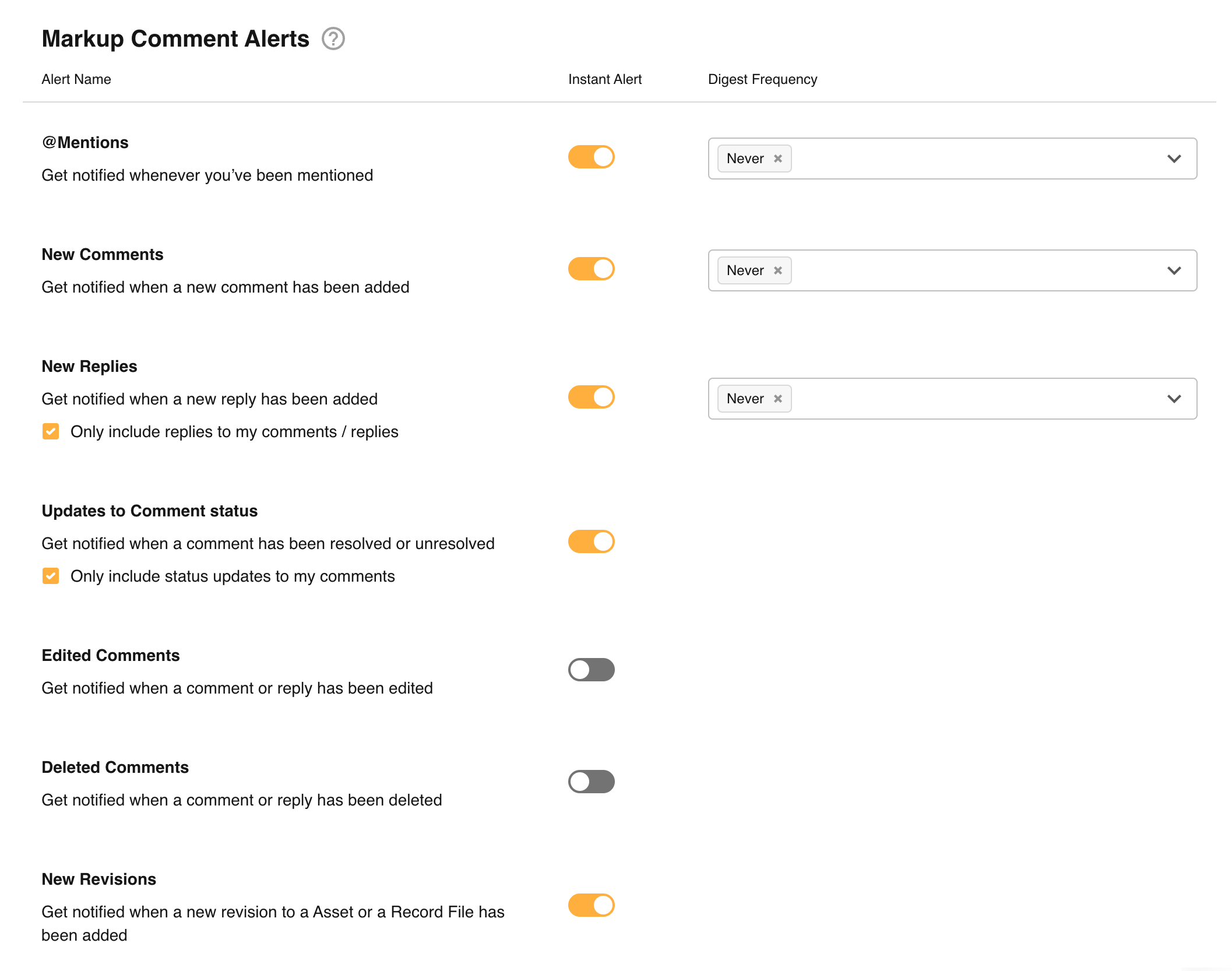 • Deleted Comments: Alert for when any Comment is Deleted (excluding their own). Note that only the Creator of a Comment is able to edit it.