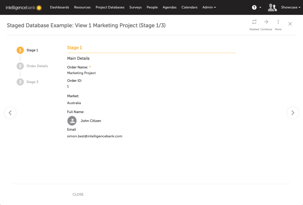 Once on the View overlay page, you'll be able to View all completed Stages, navigating to different ones via the list at the top of the page. Any Stages not enabled for View will appear greyed out, like Order Details and Stage 3 below. Your Record actions will be along the top right of the page, including shortcuts to Related items and Auto-Created Folders (if applicable). You will also be able to Continue or Revert your Staged database from this page.