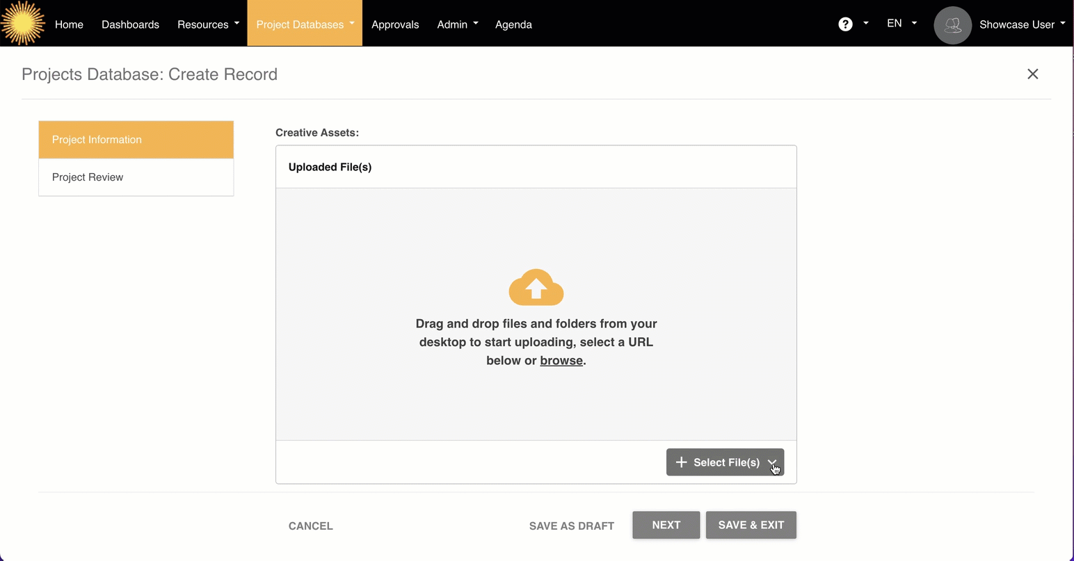 - This feature is strictly only supported on record update (edit, or continue of staged database record.) This is because a record needs to exist before a file can be saved to it.