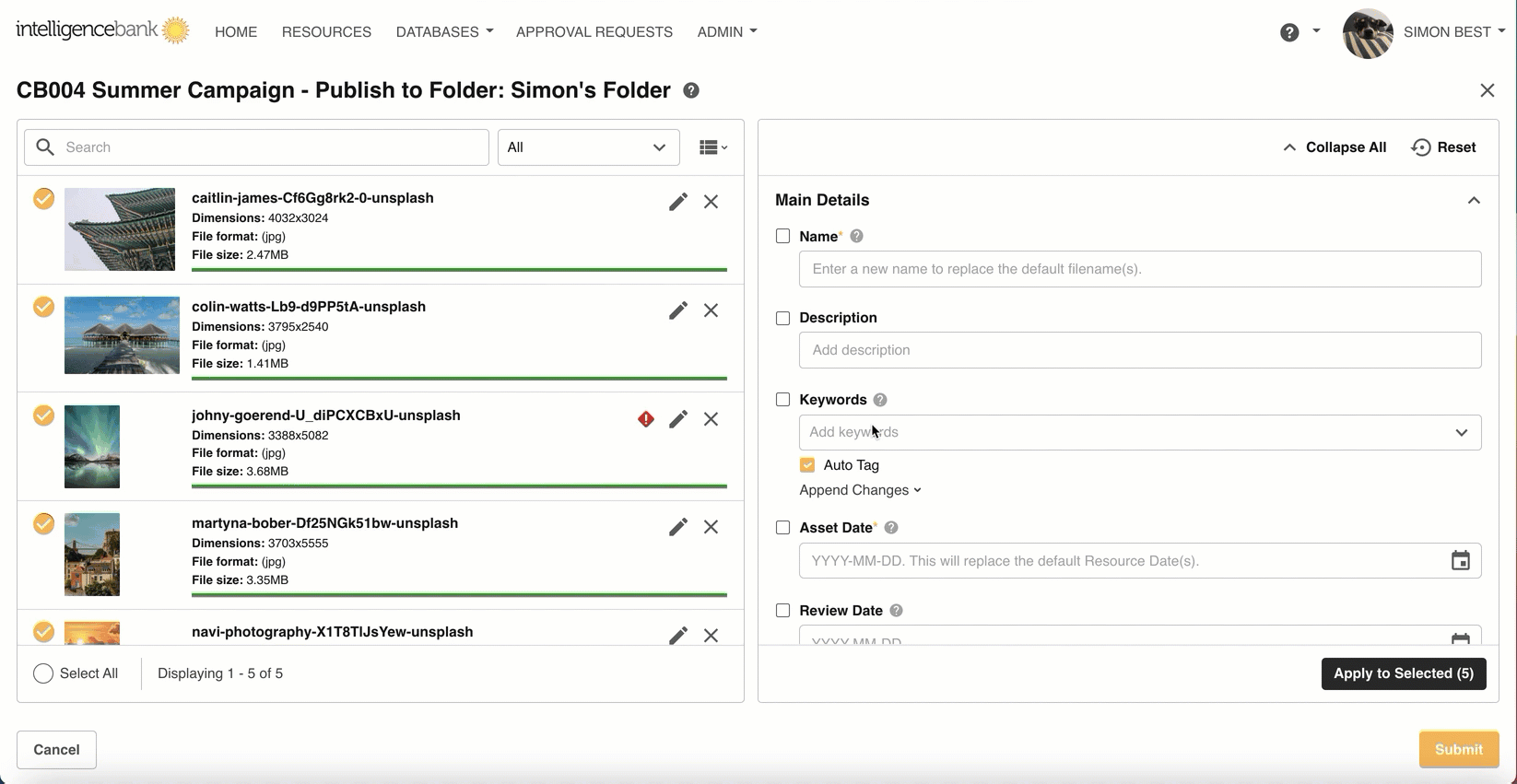 Files can only be Published to a Folder once. Resource data such as keywords, filters and Custom Upload Fields can be entered at this stage (and must be, if these fields are mandatory).
