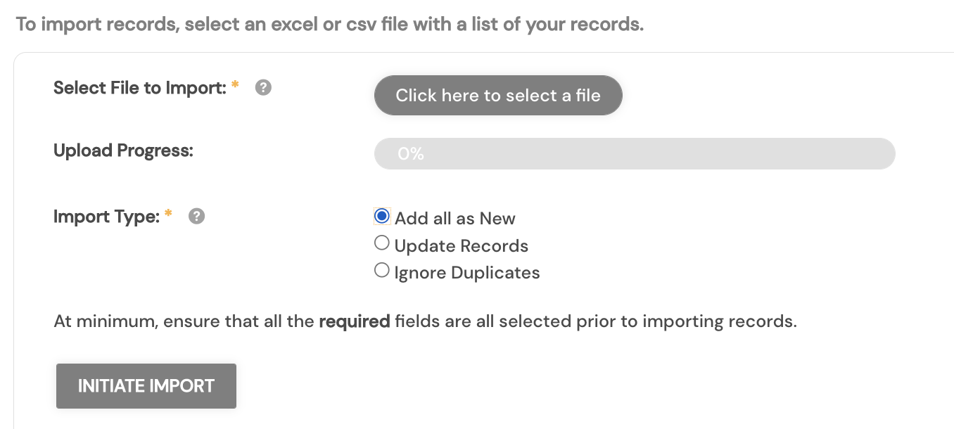 If this is the first time you are importing these records, ensure that Add all as New is selected from the Import Type option. (Click here to read how to update existing records.)