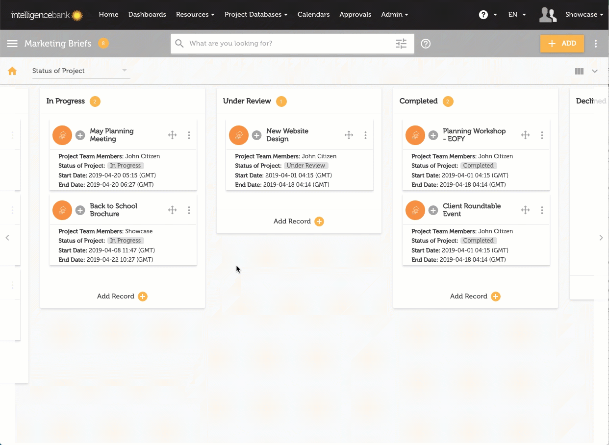 A unique feature of a Kanban view is that you can drag cards between columns which will automatically update a value within the records. This feature is only available to users with at least Edit permission on the record (as it requires the user to update a field within a form). Currently this is only supported on Single Databases.