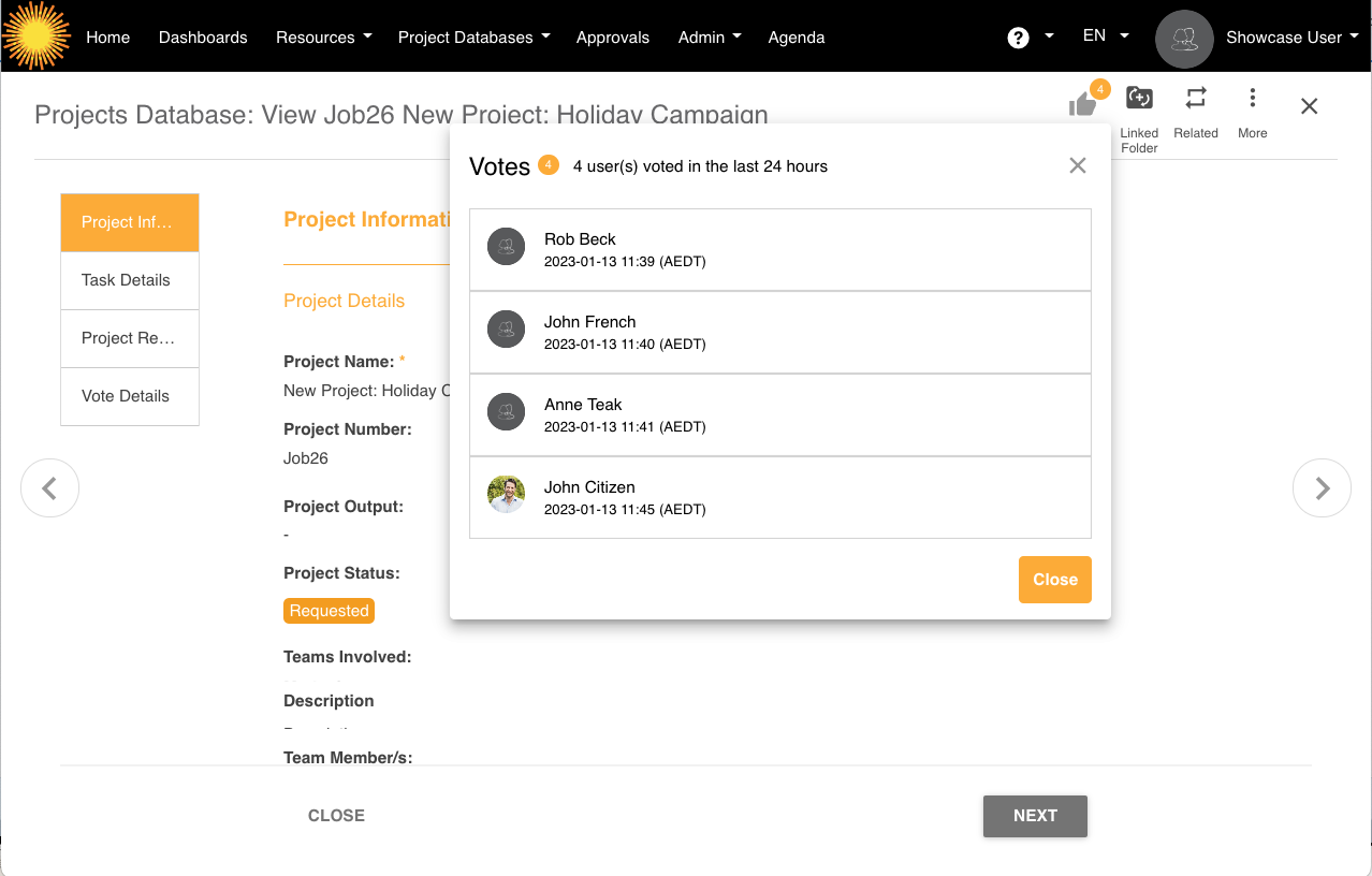 Note that the user who first saves or submits a record (including submitting it for approval, or saving as a draft) will automatically have their vote registered for that record.