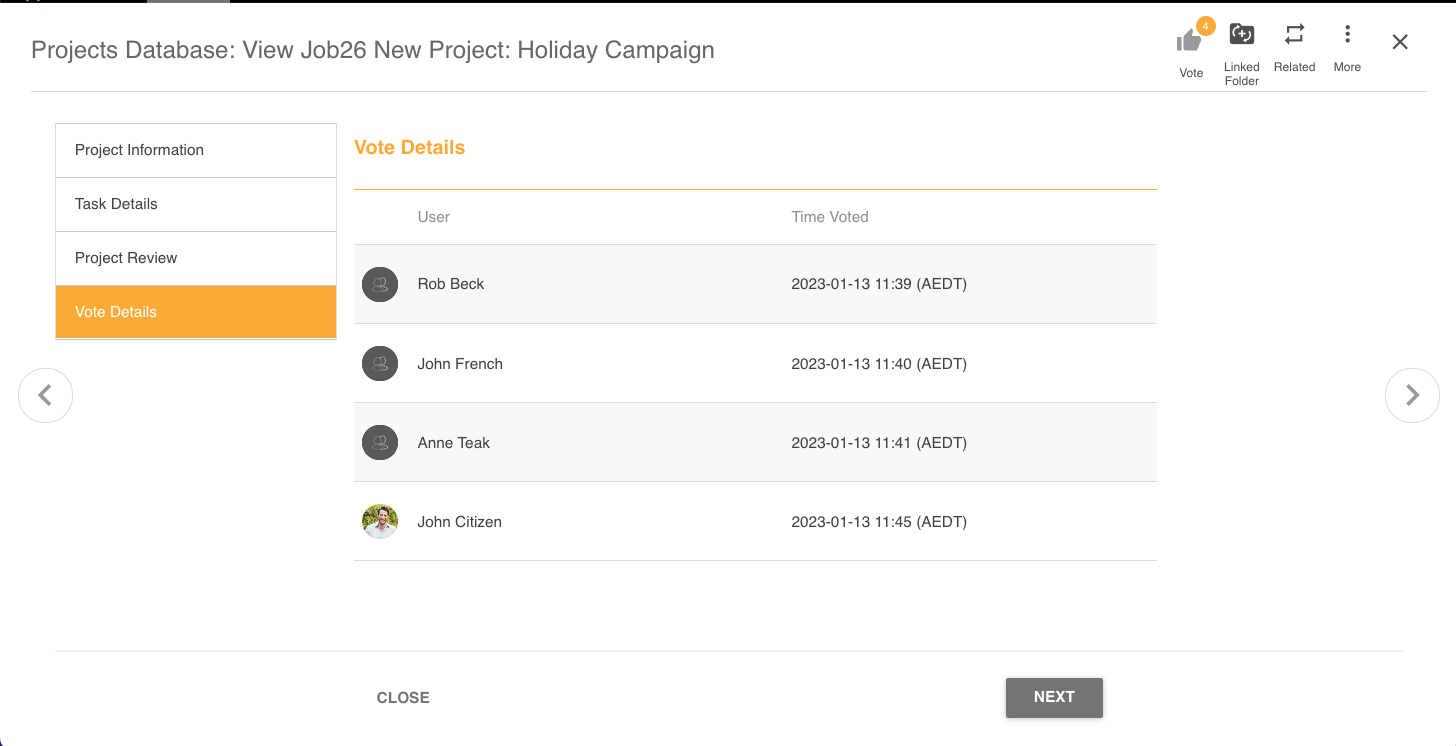 Alternatively the 'Vote Details' tab will also display a summary of who has voted: