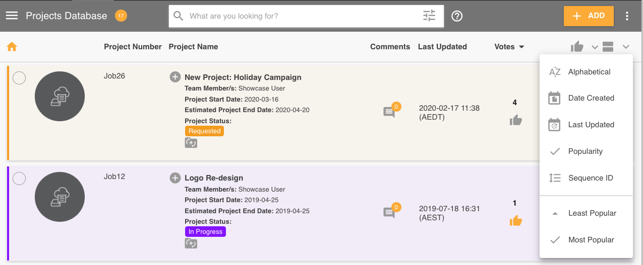 When viewing the record home in either List View or Card layout, the records can also be sorted based on the Popularity of votes.