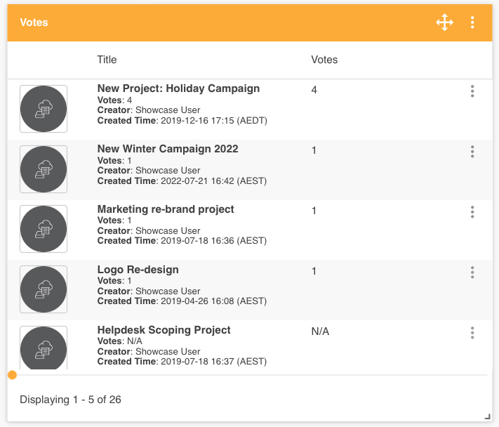Item List Widgets that are set to a specific Database (with Voting enable) can also be configured to display the number of votes for records in either the Feature Column, and/or in secondary fields, as another location to help you keep track of popular items.